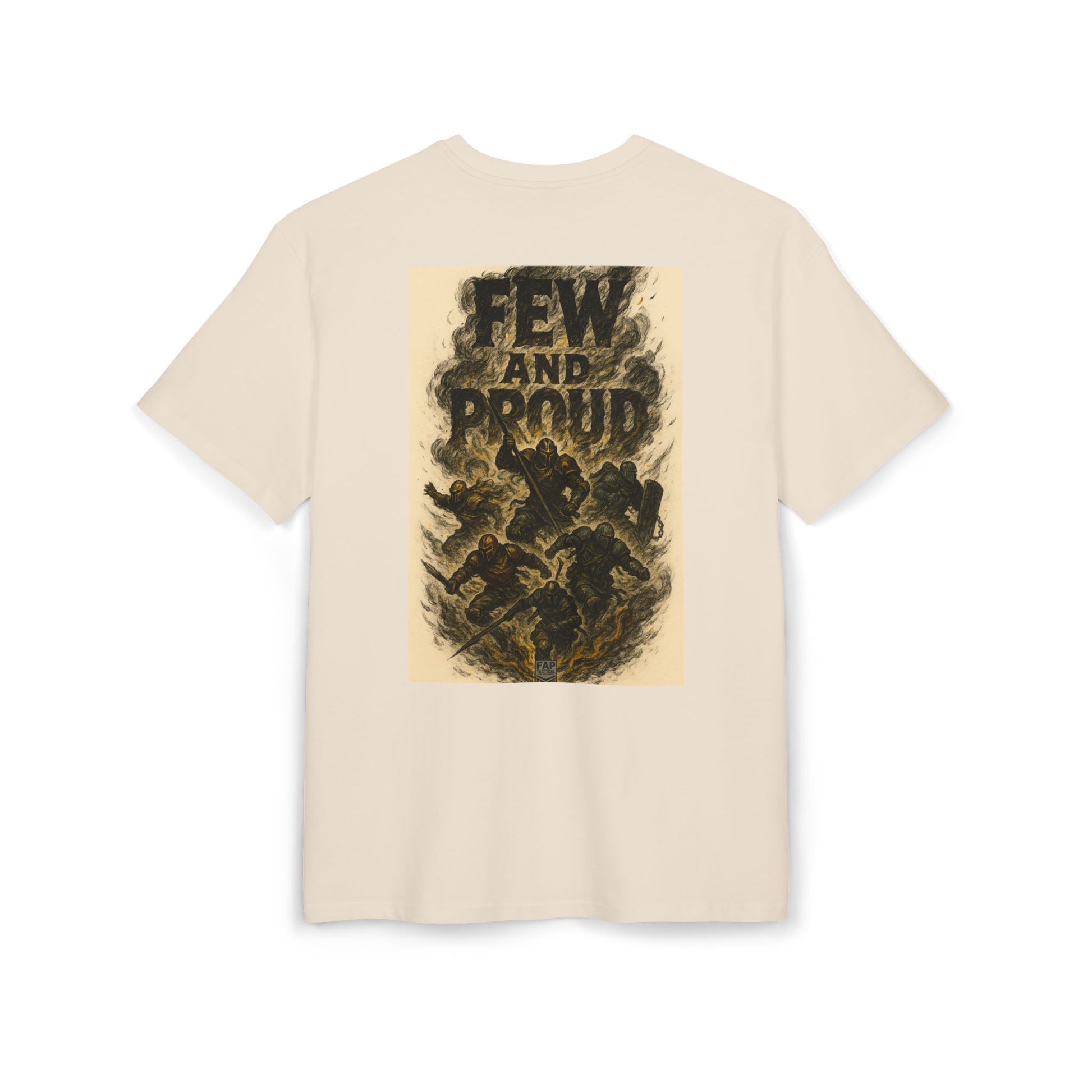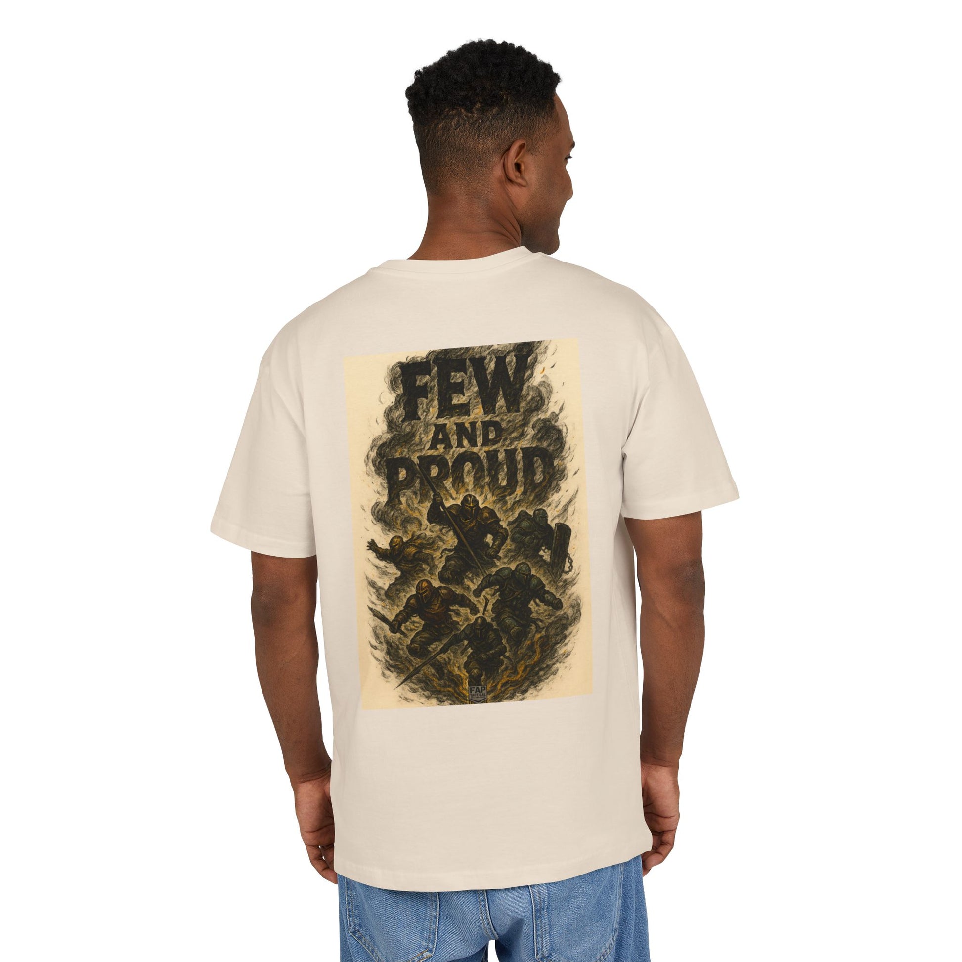 This heavy cotton tee carries a bold, vintage-poster energy: muted cream backdrop, small chest emblem and a dramatic back graphic that reads “FEW AND PROUD” over a smoky, hand-inked scene. The wide, dropped-shoulder silhouette drapes like a lived-in staple — substantial weight, crisp print contrast, and a simple crew neckline. Wear it when you want an honest, grounded look that reads like a personal statement: rugged yet refined, nostalgic but fresh. It settles into weekend routines, late-night shows, or outdoor meetups and holds up wash after wash without losing its character.