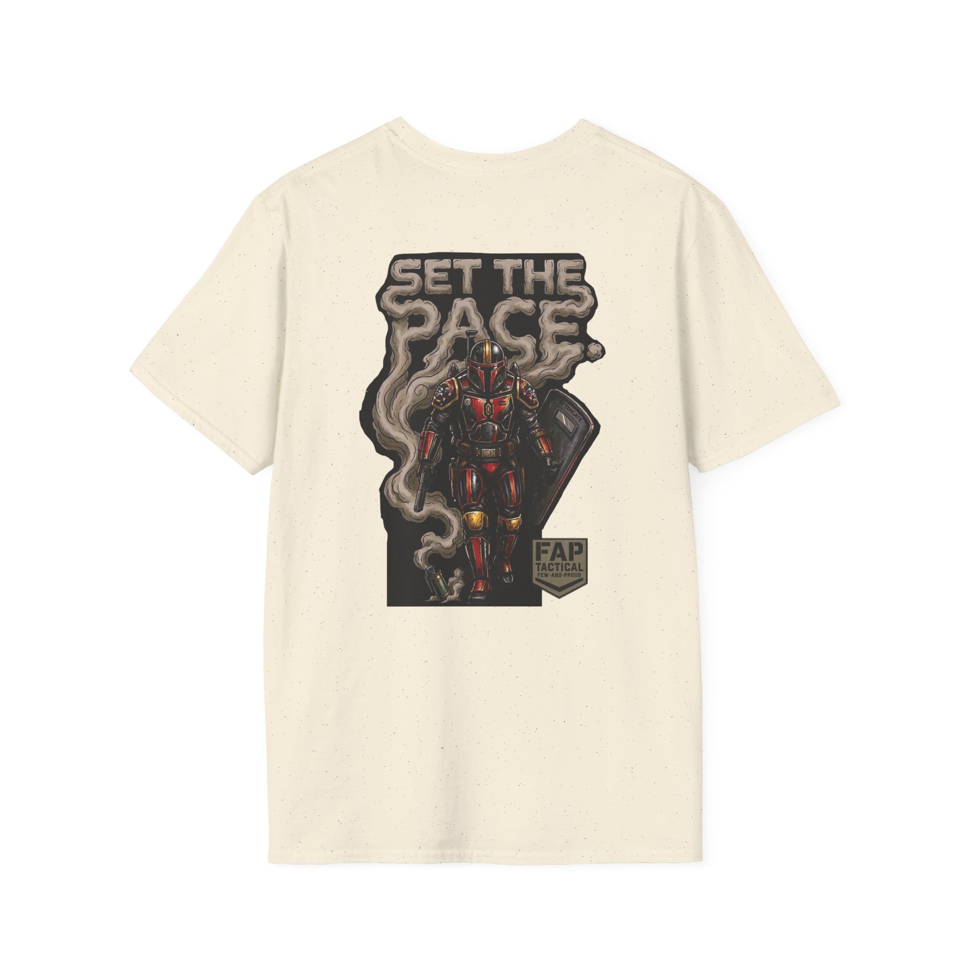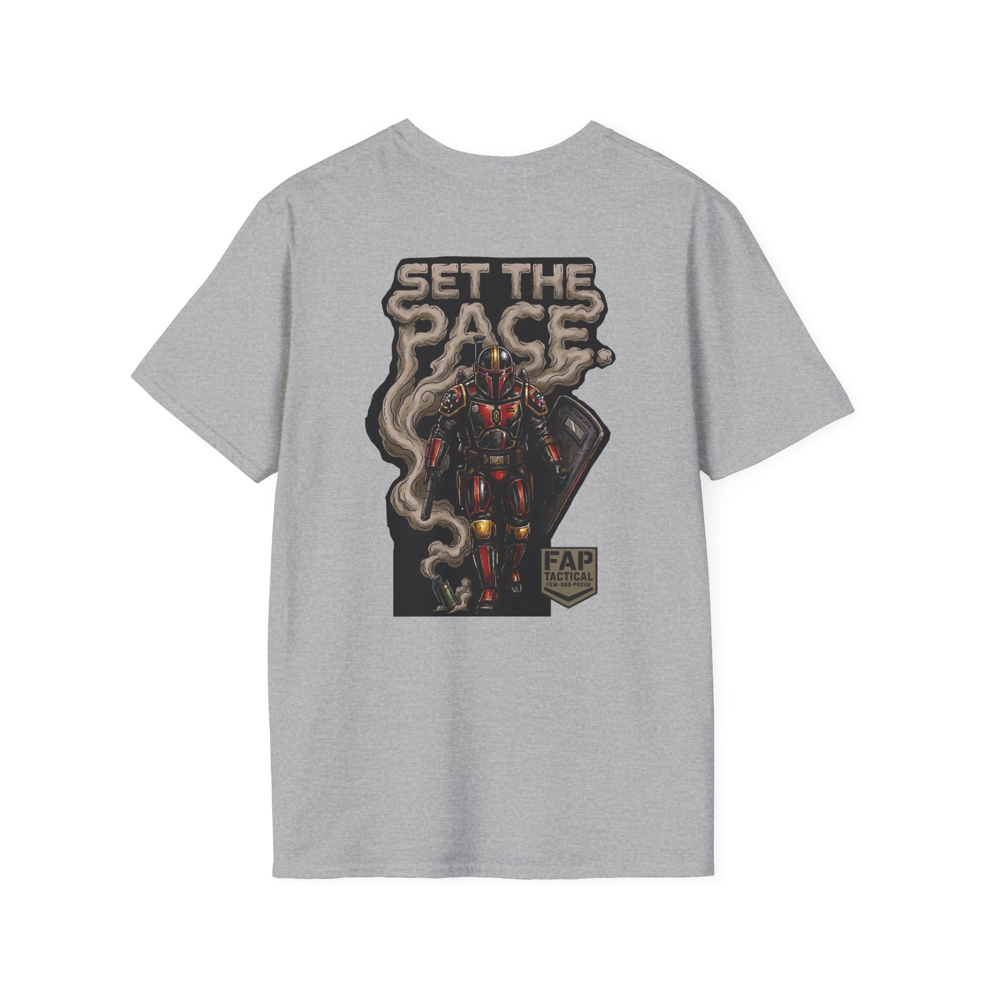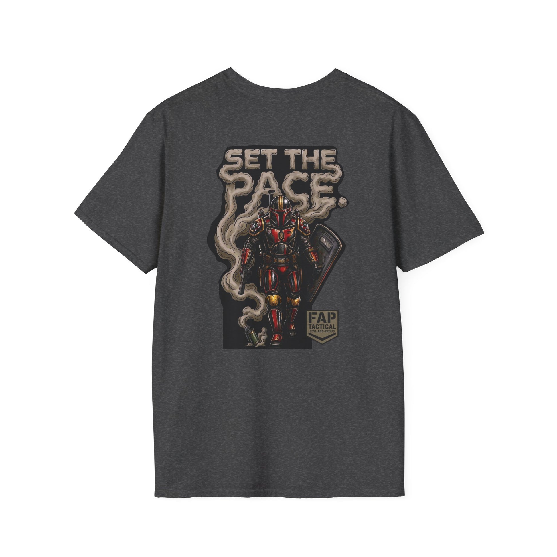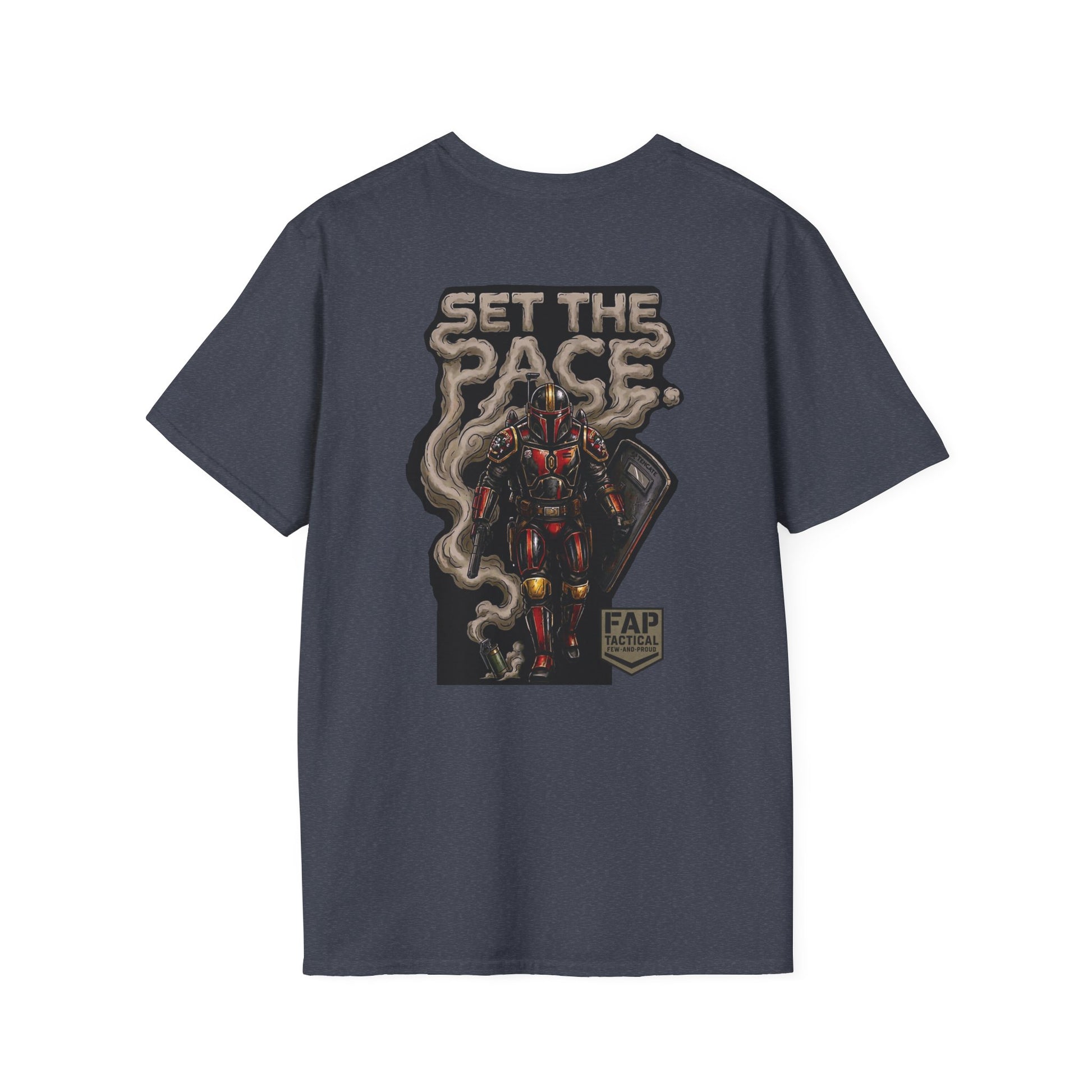 A crisp, lightweight tee built to be worn every day and to stand out without shouting. The front carries a small, subtle emblem over the heart, while the back shows a bold, illustrated figure rising through curling smoke under the headline “SET THE PACE.” The soft ring-spun cotton feels smooth against skin and keeps prints sharp; ribbed neck and shoulder tape hold the shape through repeat wear. Wear it layered under a jacket for urban nights or alone on warm days — it reads like attitude and steady craft in one shirt.