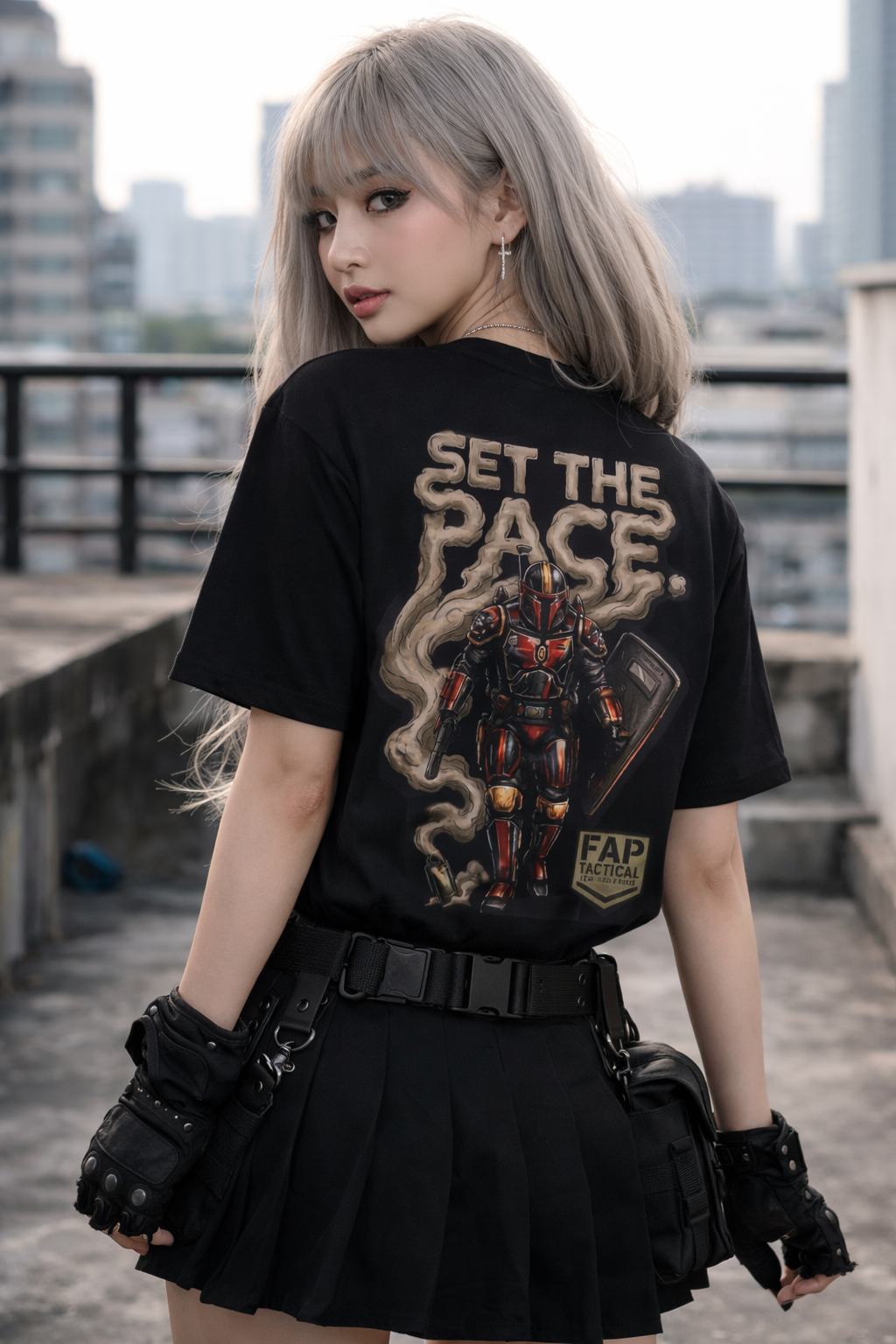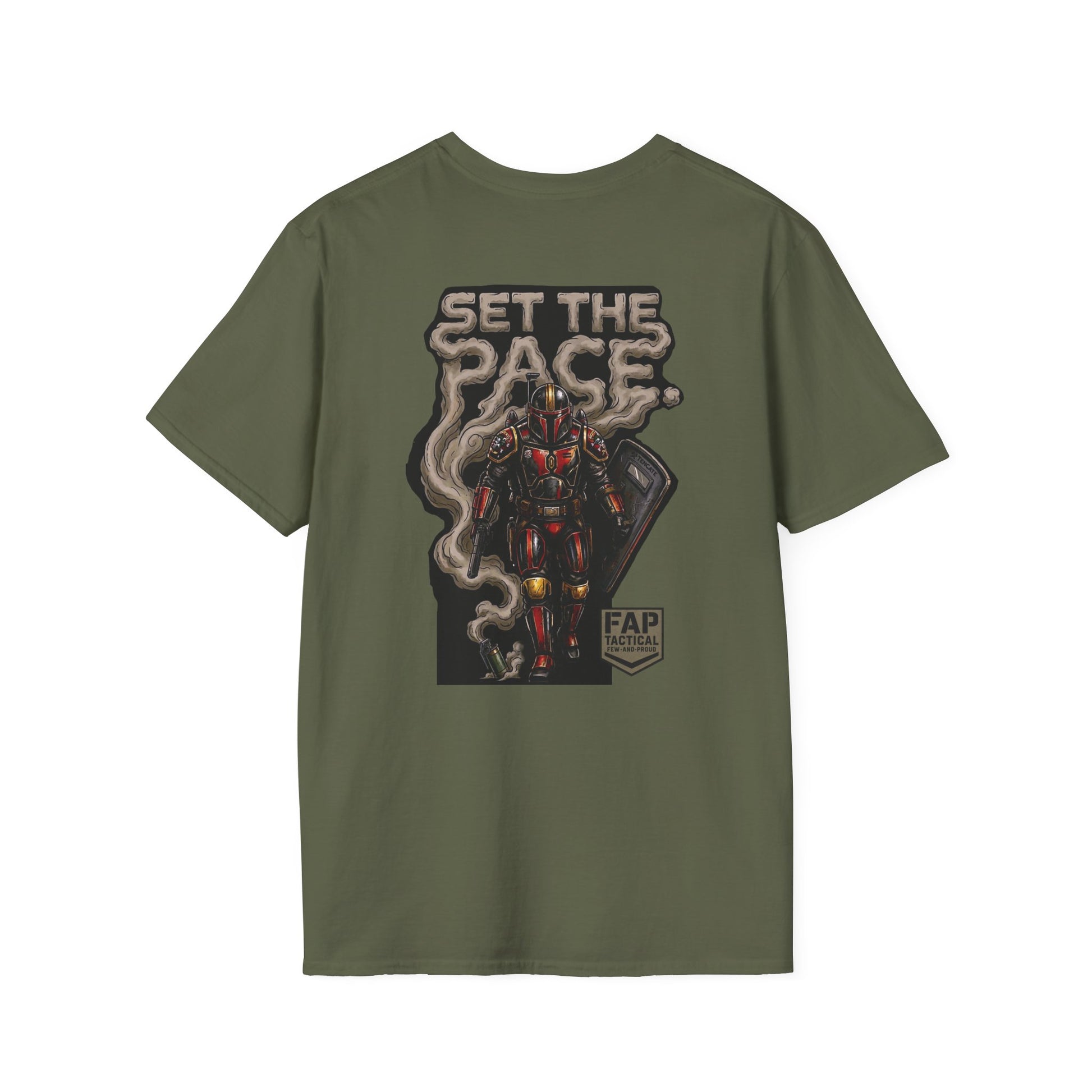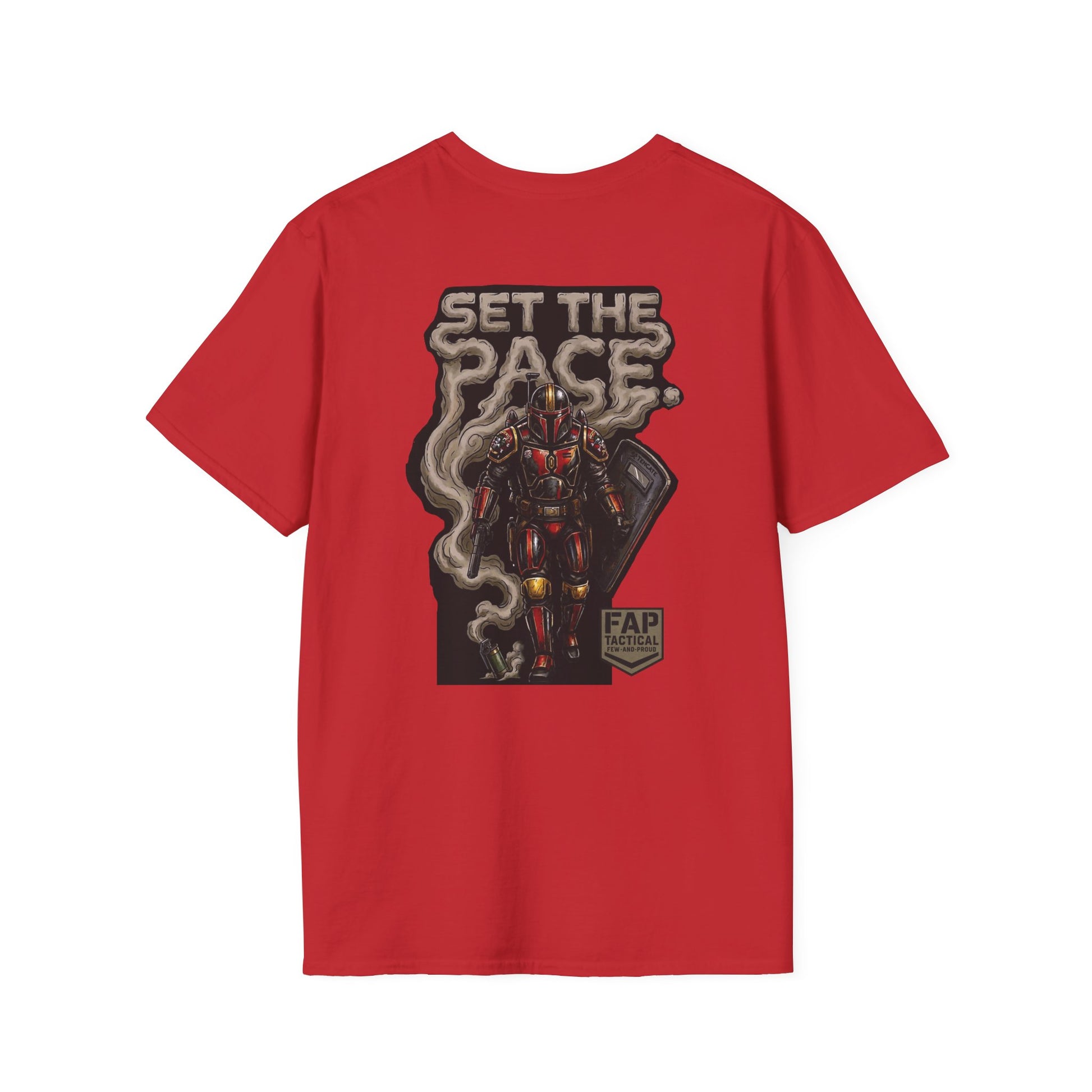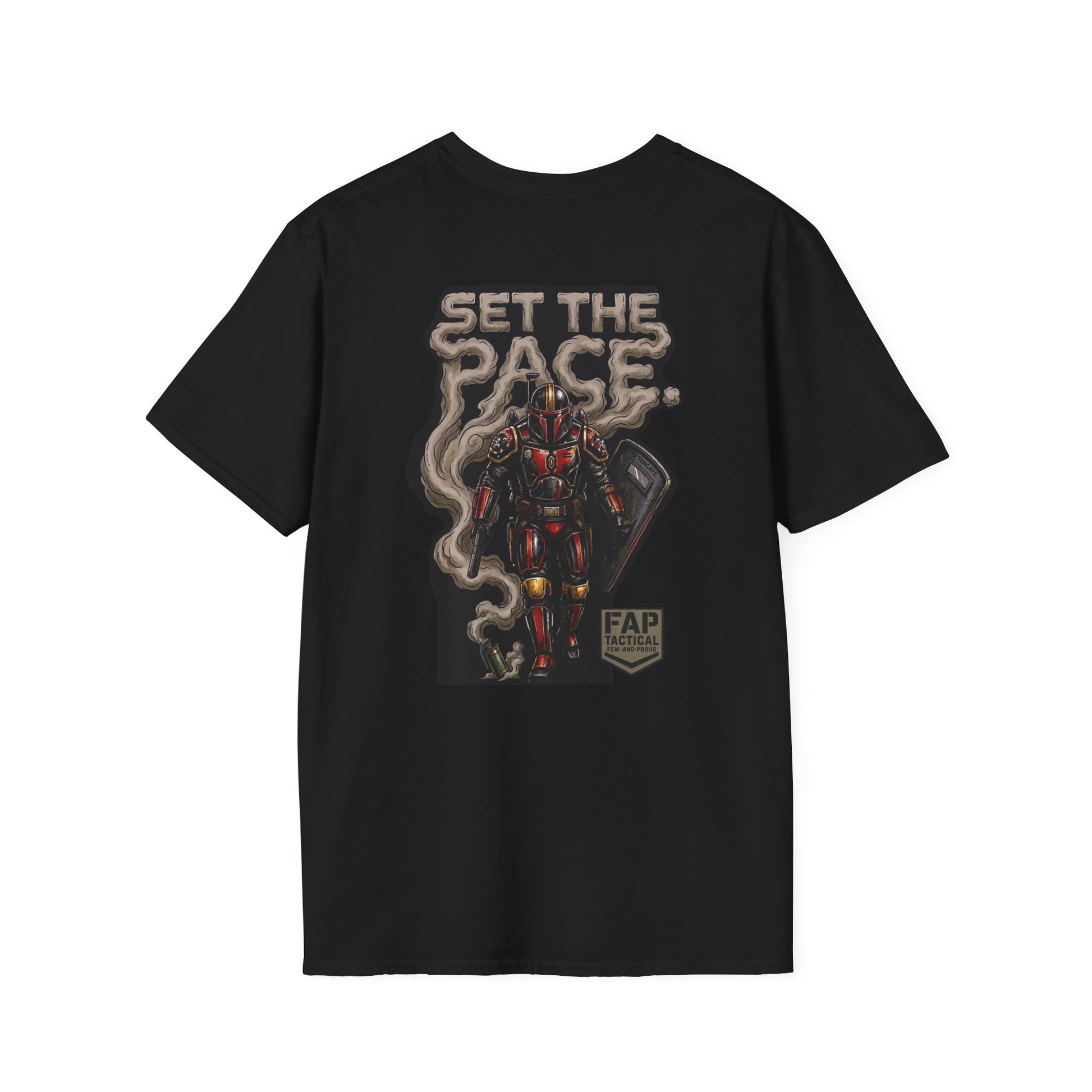 A crisp, lightweight tee built to be worn every day and to stand out without shouting. The front carries a small, subtle emblem over the heart, while the back shows a bold, illustrated figure rising through curling smoke under the headline “SET THE PACE.” The soft ring-spun cotton feels smooth against skin and keeps prints sharp; ribbed neck and shoulder tape hold the shape through repeat wear. Wear it layered under a jacket for urban nights or alone on warm days — it reads like attitude and steady craft in one shirt.