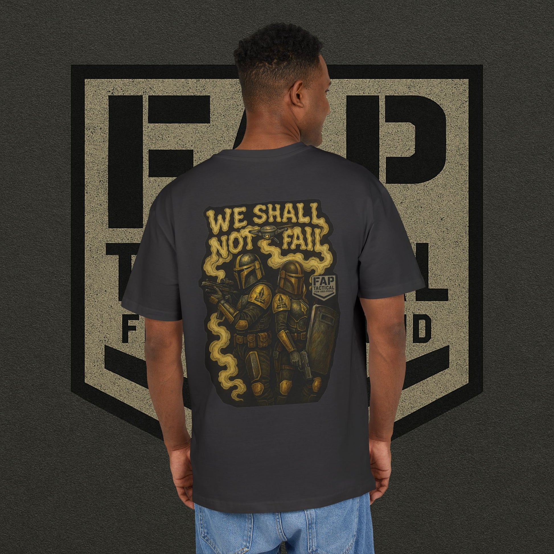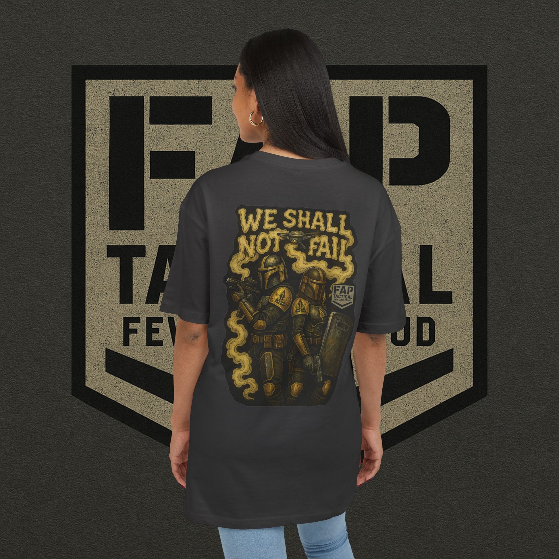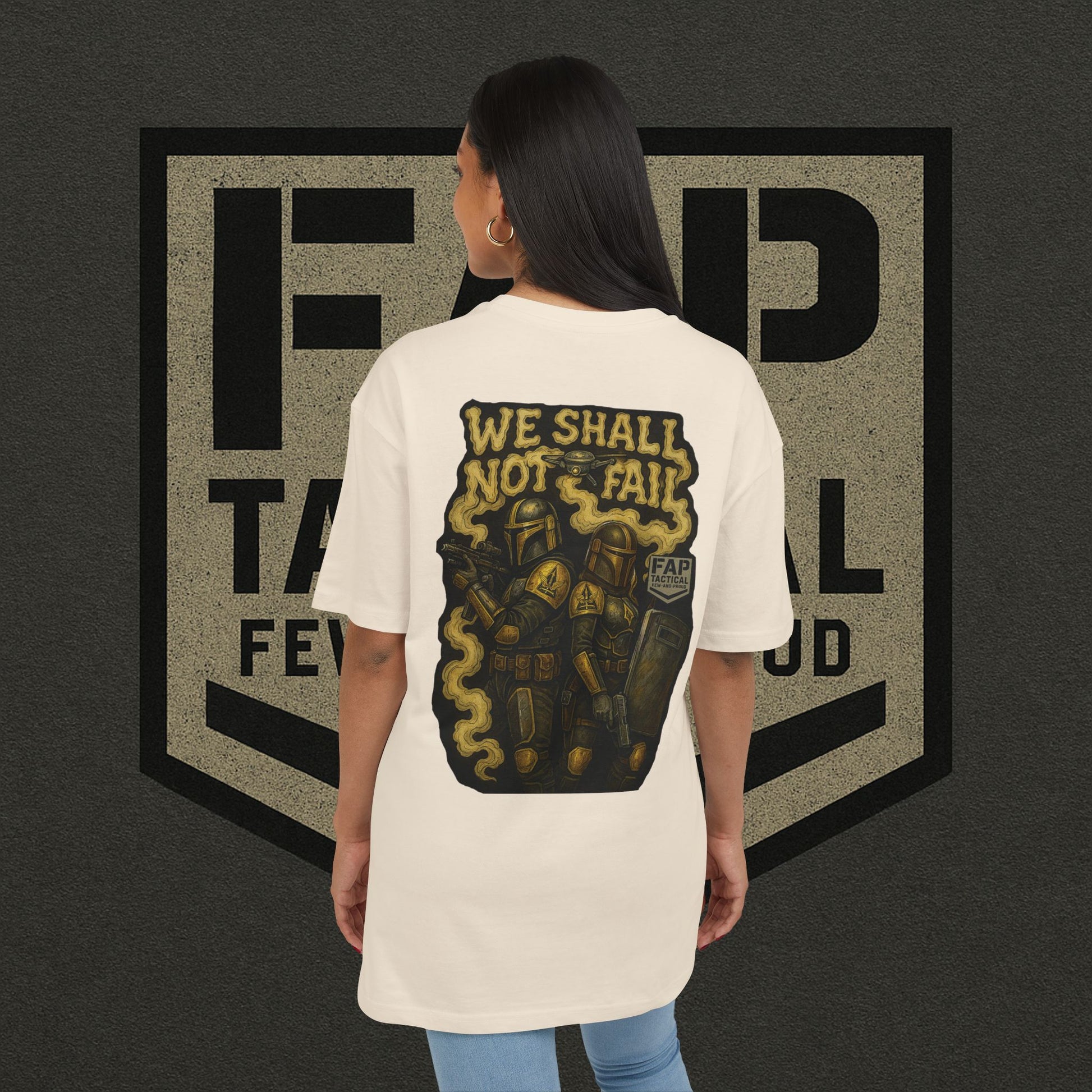 This heavy cotton tee feels like a rallying banner you can wear. The wide, dropped-shoulder silhouette sits roomy and relaxed, giving the chest art space to breathe. Front and full-back artwork blend medieval grit with modern streetwear — knights, shields and a coiled banner that reads a resolute mantra. It’s the kind of shirt you reach for when you want to show steady resolve without shouting: worn to rehearsals, late-night shows, protest lines, or days when you need a quiet reminder to stand your ground. The heavyweight fabric holds print detail crisply and softens with each wash, aging into the kind of lived-in comfort that still looks intentional.