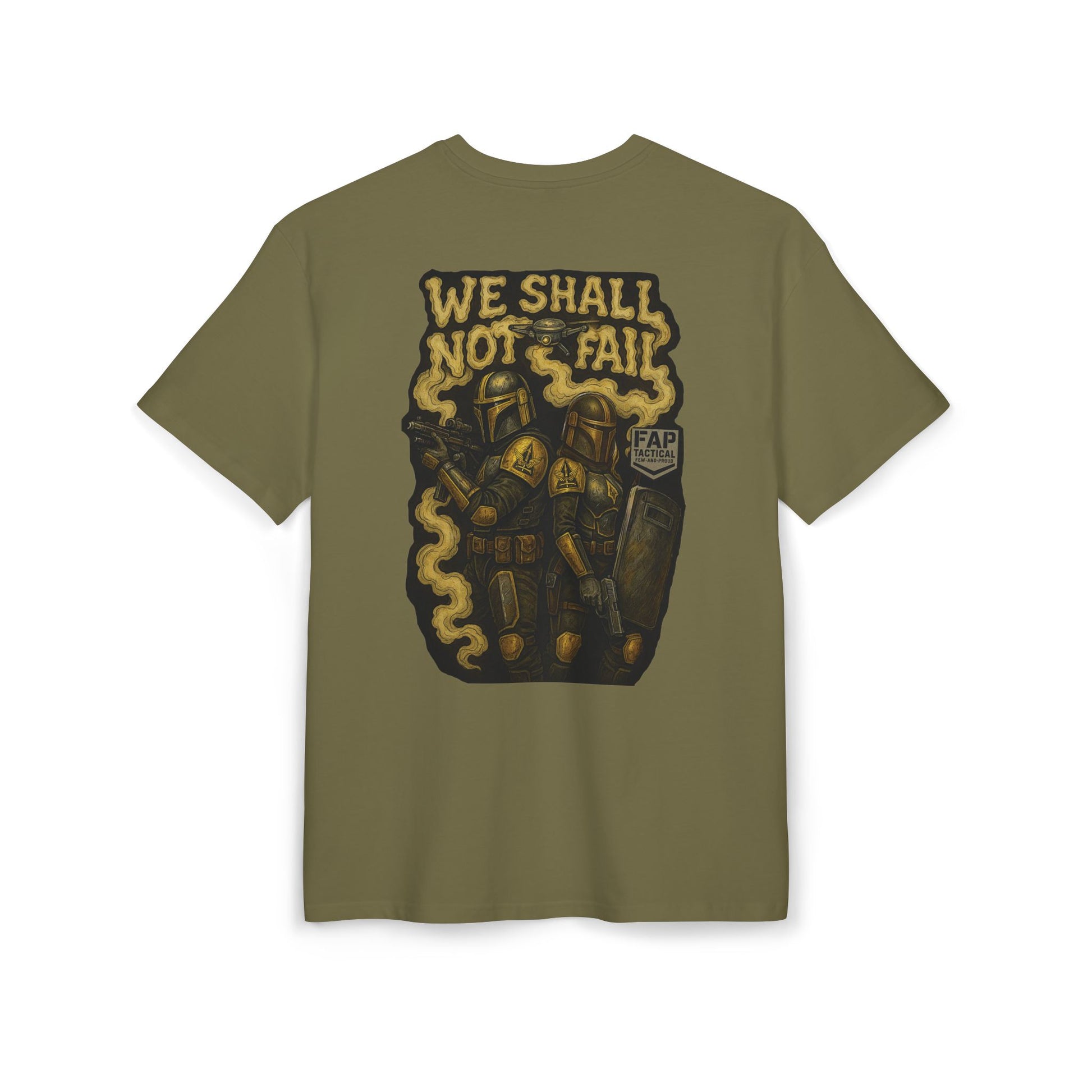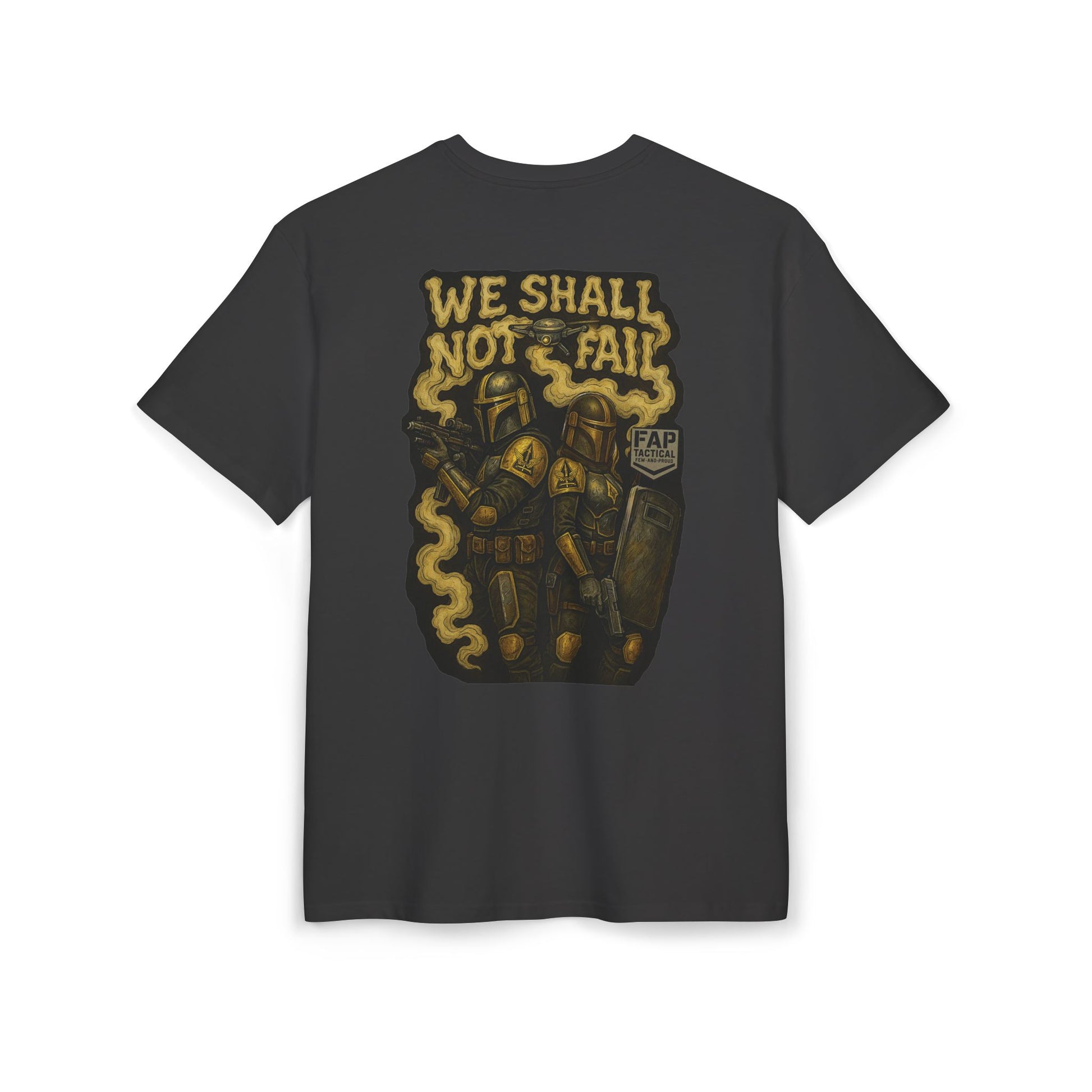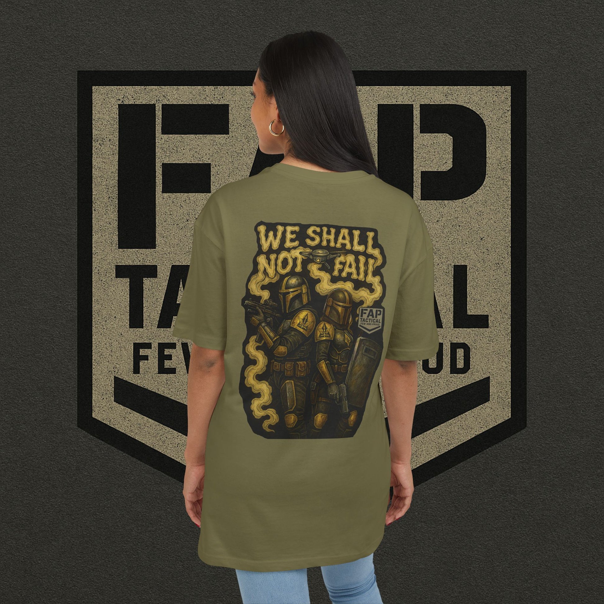 This heavy cotton tee feels like a rallying banner you can wear. The wide, dropped-shoulder silhouette sits roomy and relaxed, giving the chest art space to breathe. Front and full-back artwork blend medieval grit with modern streetwear — knights, shields and a coiled banner that reads a resolute mantra. It’s the kind of shirt you reach for when you want to show steady resolve without shouting: worn to rehearsals, late-night shows, protest lines, or days when you need a quiet reminder to stand your ground. The heavyweight fabric holds print detail crisply and softens with each wash, aging into the kind of lived-in comfort that still looks intentional.